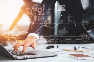 Businessman working using laptop computer with strategy and growth of business on screen